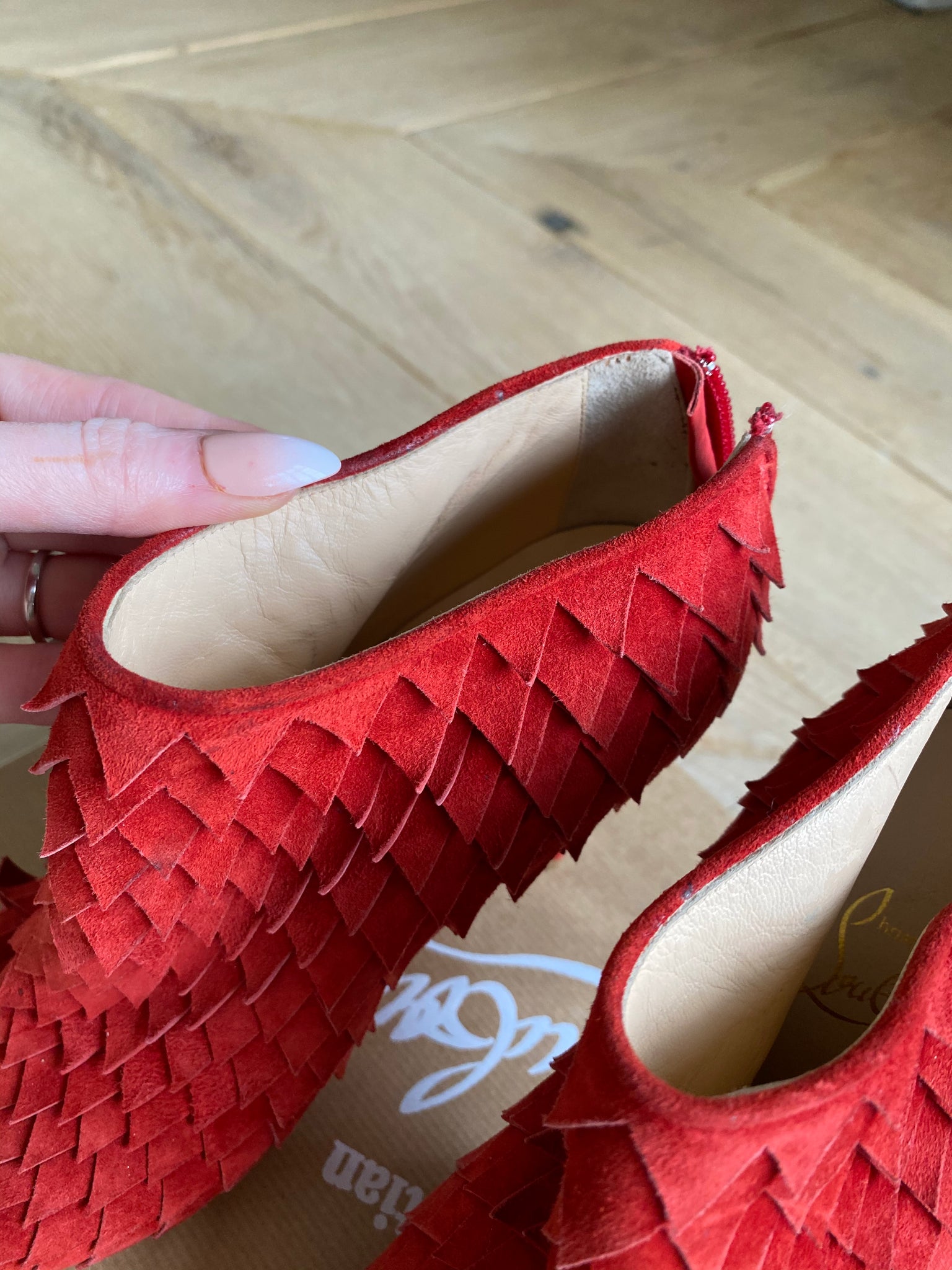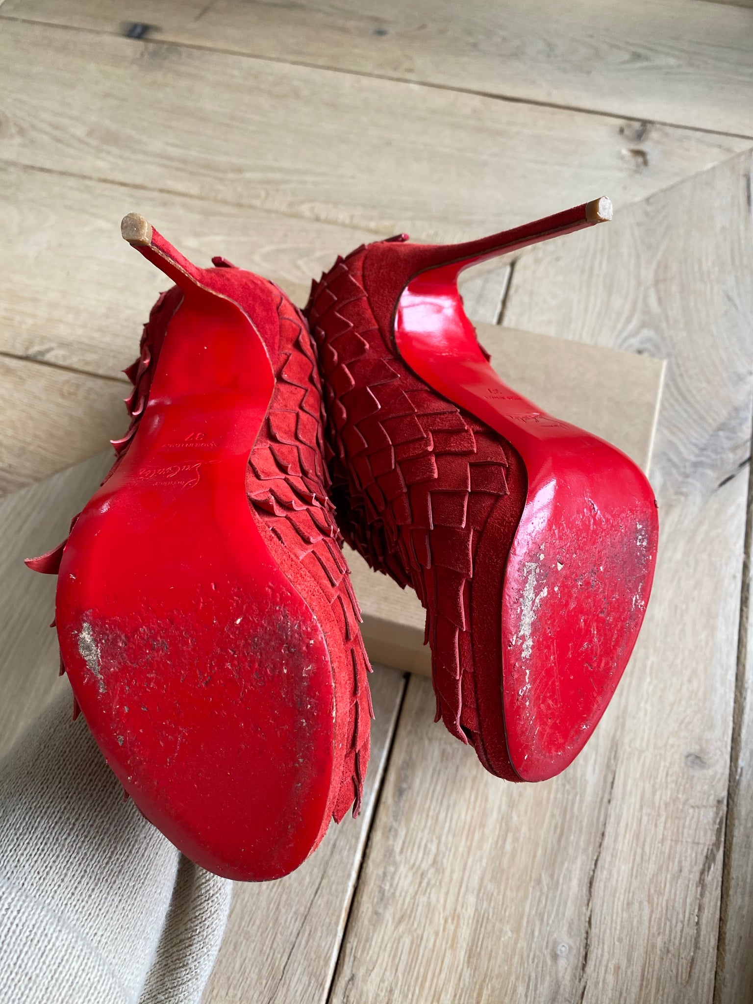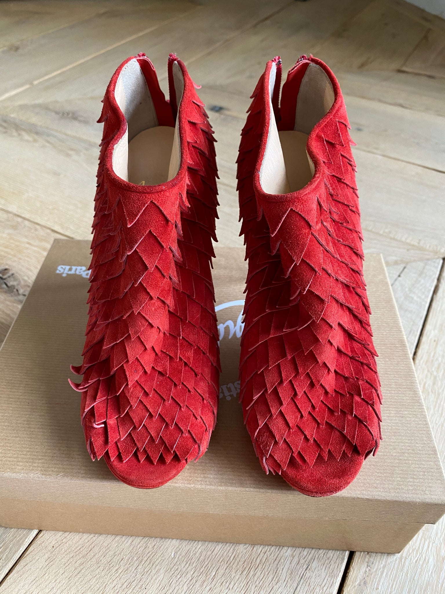 Red suede shoe boot. High heel and zip fastening. Boxed.