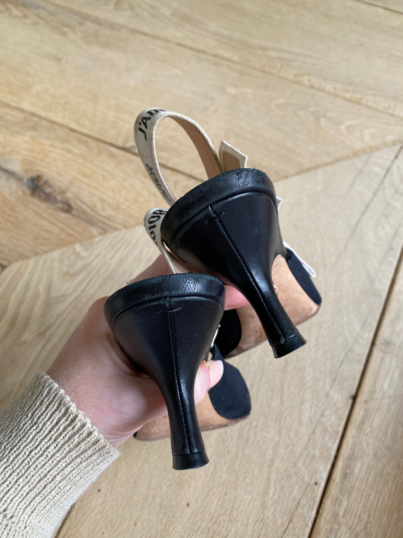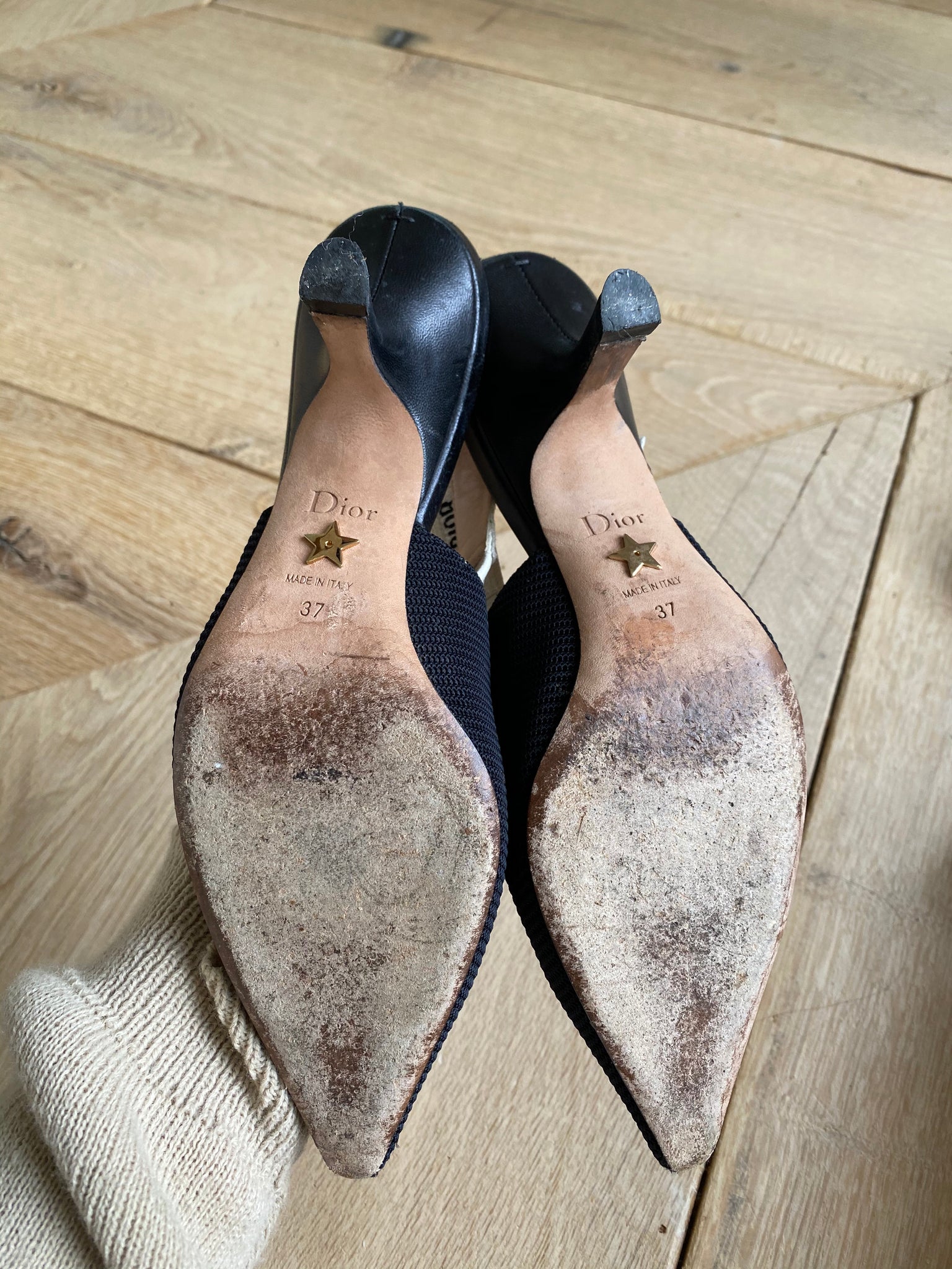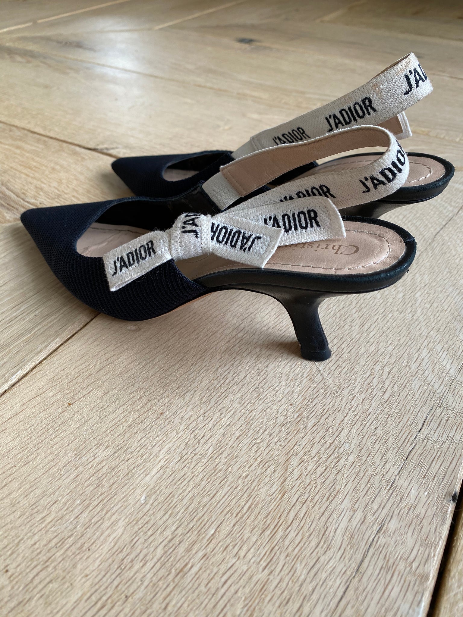 Slingback black pumps with kitten heel. Logo ‘j’adior’ embroidered ribbon. Unboxed.